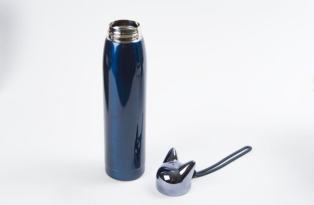 Termos albastru din oțel inoxidabil cu capac în formă de cap de pisică. Păstrează băuturile calde ore întregi. Temperatura scade de la 100° C la 70° C în aproximativ 3 ore la temperatura ambiantă de 22-25°.